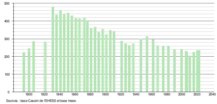 L'évolution du nombre d'habitants est connue à travers les recensements de la population effectués dans la commune depuis 1793. Pour les communes de moins de 10 000 habitants, une enquête de recensement portant sur toute la population est réalisée tous les cinq ans, les populations de référence des années intermédiaires étant quant à elles estimées par interpolation ou extrapolation[30]. Pour la commune, le premier recensement exhaustif entrant dans le cadre du nouveau dispositif a été réalisé en 2005[31].