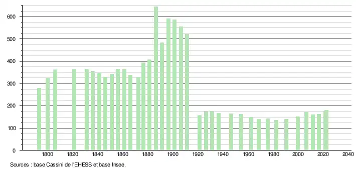 L'évolution du nombre d'habitants est connue à travers les recensements de la population effectués dans la commune depuis 1793. Pour les communes de moins de 10 000 habitants, une enquête de recensement portant sur toute la population est réalisée tous les cinq ans, les populations de référence des années intermédiaires étant quant à elles estimées par interpolation ou extrapolation[20]. Pour la commune, le premier recensement exhaustif entrant dans le cadre du nouveau dispositif a été réalisé en 2006[21].