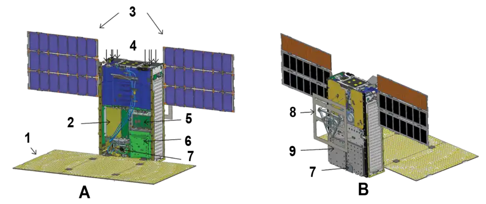 MarCO-A et MarCO-B[3] sont deux nano-satellites de format CubeSats 6U de 13,5 kg ayant la forme d'un parallélépipède de 36,6 × 24,3 × 11,8 cm. Chacun dispose de deux panneaux solaires (30 × 30 cm) et de deux antennes, qui sont déployés en orbite. Les panneaux solaires fournissent 35 watts au niveau de l'orbite terrestre et 17 watts au niveau de l'orbite martienne. Des batteries lithium-ion sont utilisées durant la phase de retransmission des données de la descente vers Mars. La charge utile expérimentale est constituée par l'émetteur/récepteur "Iris" fonctionnant à la fois en bande UHF (réception uniquement) et en bande X (émission/réception). Celui-ci est capable de recevoir à proximité de Mars les émissions radio d'InSight (en UHF à faible distance) avec un débit de 8 kilobits par seconde et de les retransmettre en temps réel en bande X vers les stations terrestres avec le même débit malgré la puissance limitée à 5 watts et l'éloignement de la Terre (environ 150 millions de kilomètres). Quatre antennes par satellite dont deux déployables pour les liaisons radio sont utilisées. Une antenne grand gain plate réfléchissante constituée d'un ensemble d'antennes patch est déployée en orbite et est utilisée pour la transmission en bande X vers la Terre du flux de données transmis par InSight durant sa descente vers le sol de Mars. Deux autres antennes utilisées en bande X à faible gain et à moyen gain permettent de recevoir des commandes depuis le contrôle au sol et d'émettre des données à proximité de la Terre en début du mission. L'autre antenne déployable est utilisée pour recevoir les émissions en UHF d'InSight. Les deux antennes déployables font un angle de 90°. Deux petites caméras filmeront le déploiement des deux antennes déployables et transmettront à la Terre des images avec une résolution de 752 x 480 pixels. Ils sont stabilisés 3 axes (son orientation est fixe dans l'espace) à l'aide de roues de réaction[2],[4].