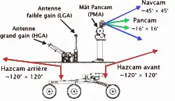 - une antenne grand gain (HGA) parabolique de 28 cm de diamètre est utilisée pour communiquer directement avec la Terre en bande X. La bande X est privilégiée sur les sondes spatiales car elle permet le transfert de volumes importants de données sans nécessiter de grandes quantités d'énergie. L'antenne peut être pointée avec précision vers la Terre grâce à deux moteurs fournissant deux degrés de liberté[15]. Son débit est de 11 kbit/s pendant trois heures par jour au maximum. Elle a été ajoutée à l'équipement du rover pour compenser l'abandon du réseau de satellites de télécommunications martiens. Pour que la masse du rover reste identique, il a fallu supprimer le spectromètre Raman, un des instruments scientifiques prévu dans la mission initiale[11] ;