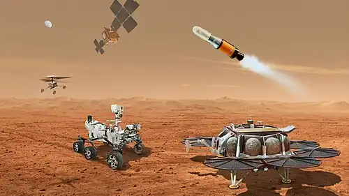 Selon le scénario en vigueur en , deux sondes spatiales développées respectivement par la NASA et l'Agence spatiale européenne doivent être lancées en 2026 dans le but de récupérer les échantillons de sol déposés sur Mars par l'astromobile Perseverance et les ramener sur Terre en 2031[14]. En 2018 la phase de spécifications des deux missions démarrent à l'Agence spatiale européenne et à la NASA[25]. Elles sont en partie confiées à Airbus Defence and Space[26]. Des fonds sont mobilisés pour réaliser ces travaux, mais les deux agences n'ont pas le budget pour les réaliser.