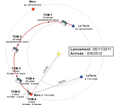 - ↑ (en) « Curiosity's Daily Update: Course Maneuver Successful; MSL Begins Final Approach », NASA/JPL, .