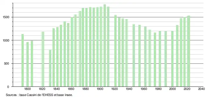 L'évolution du nombre d'habitants est connue à travers les recensements de la population effectués dans la commune depuis 1793. Pour les communes de moins de 10 000 habitants, une enquête de recensement portant sur toute la population est réalisée tous les cinq ans, les populations de référence des années intermédiaires étant quant à elles estimées par interpolation ou extrapolation[29]. Pour la commune, le premier recensement exhaustif entrant dans le cadre du nouveau dispositif a été réalisé en 2006[30].