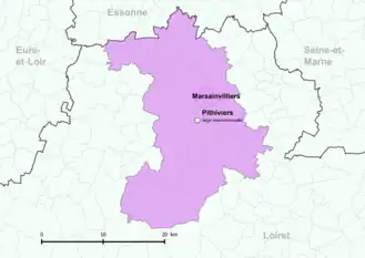 La loi du portant nouvelle organisation territoriale de la République (dite loi NOTRe), visant une réduction du nombre d'intercommunalités en France, fait en effet passer le seuil démographique minimal de 5 000 à 15 000 habitants, sauf exceptions, et a un impact sur les périmètres des différentes intercommunalités. Le schéma départemental de coopération intercommunale du Loiret est arrêté sur ces bases le et le nombre d'établissements publics de coopération intercommunale à fiscalité propre passe dans le département du Loiret de 28 (2 communautés d'agglomération et 26 communautés de communes) à 16 (deux communautés d'agglomération et 14 communautés de communes dont une interdépartementale)[38]. Les communautés de communes de Beauce et du Gâtinais, du Cœur du Pithiverais et du Plateau Beauceron fusionnent ainsi à compter du en une seule entité : la communauté de communes du Pithiverais, dont le siège est à Pithiviers. Cette nouvelle intercommunalité comprend 31 communes dont Marsainvilliers[39].