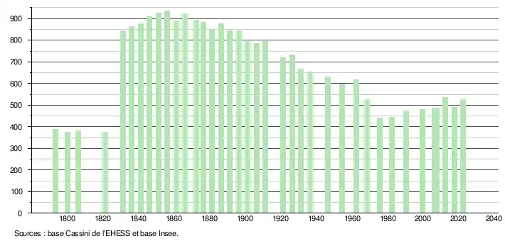 L'évolution du nombre d'habitants est connue à travers les recensements de la population effectués dans la commune depuis 1793. Pour les communes de moins de 10 000 habitants, une enquête de recensement portant sur toute la population est réalisée tous les cinq ans, les populations de référence des années intermédiaires étant quant à elles estimées par interpolation ou extrapolation[22]. Pour la commune, le premier recensement exhaustif entrant dans le cadre du nouveau dispositif a été réalisé en 2007[23].