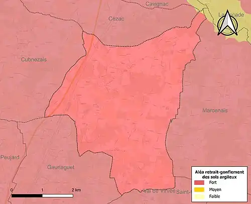 Le retrait-gonflement des sols argileux est susceptible d'engendrer des dommages importants aux bâtiments en cas d’alternance de périodes de sécheresse et de pluie. La totalité de la commune est en aléa moyen ou fort (67,4 % au niveau départemental et 48,5 % au niveau national). Sur les 483 bâtiments dénombrés sur la commune en 2019, 483 sont en aléa moyen ou fort, soit 100 %, à comparer aux 84 % au niveau départemental et 54 % au niveau national. Une cartographie de l'exposition du territoire national au retrait gonflement des sols argileux est disponible sur le site du BRGM[19],[Carte 2].