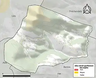 Le retrait-gonflement des sols argileux est susceptible d'engendrer des dommages importants aux bâtiments en cas d’alternance de périodes de sécheresse et de pluie. La totalité de la commune est en aléa faible (44,5 % au niveau départemental et 48,5 % au niveau national). Sur les 49 bâtiments dénombrés sur la commune en 2019, aucun n'est en aléa moyen ou fort, à comparer aux 75 % au niveau départemental et 54 % au niveau national. Une cartographie de l'exposition du territoire national au retrait gonflement des sols argileux est disponible sur le site du BRGM[30],[Carte 3].