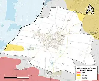 Le retrait-gonflement des sols argileux est susceptible d'engendrer des dommages importants aux bâtiments en cas d’alternance de périodes de sécheresse et de pluie. 4,3 % de la superficie communale est en aléa moyen ou fort (54,2 % au niveau départemental et 48,5 % au niveau national). Sur les 1 431 bâtiments dénombrés sur la commune en 2019, aucun n'est en aléa moyen ou fort, à comparer aux 57 % au niveau départemental et 54 % au niveau national. Une cartographie de l'exposition du territoire national au retrait gonflement des sols argileux est disponible sur le site du BRGM[19],[Carte 2].