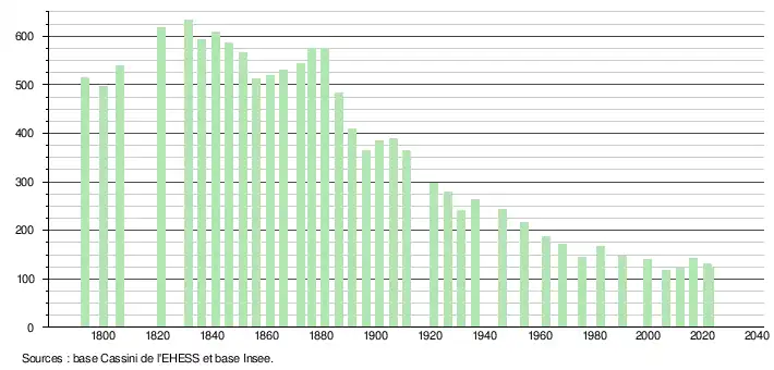 L'évolution du nombre d'habitants est connue à travers les recensements de la population effectués dans la commune depuis 1793. Pour les communes de moins de 10 000 habitants, une enquête de recensement portant sur toute la population est réalisée tous les cinq ans, les populations de référence des années intermédiaires étant quant à elles estimées par interpolation ou extrapolation[21]. Pour la commune, le premier recensement exhaustif entrant dans le cadre du nouveau dispositif a été réalisé en 2006[22].