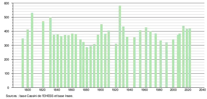 - ↑ Population municipale de référence en vigueur au 1er janvier 2025, millésimée 2022, définie dans les limites territoriales en vigueur au 1er janvier 2024, date de référence statistique : 1er janvier 2022.