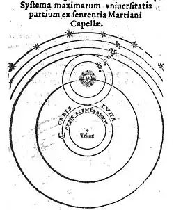 Martianus expose la conception géo-héliocentrique d’Héraclide du Pont en vertu de laquelle Vénus et Mercure tournent autour du Soleil (voir illustration ci-joint), tandis que la Terre est stationnaire ; Copernic fera référence à ce passage du De Nuptiis dans son De revolutionibus orbium coelestium (I.10)[26]. Martianus présente également la théorie opposée du géocentrisme, qui est soutenue par Ptolémée, sans marquer de préférence entre les deux. Il explique les différences climatiques à la surface de la Terre et les variations d'ensoleillement, tout en établissant des rapports avec les orbites des planètes et donnant la cause des éclipses[27].