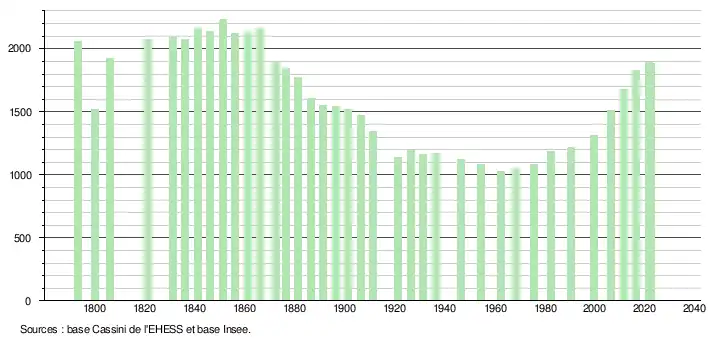 L'évolution du nombre d'habitants est connue à travers les recensements de la population effectués dans la commune depuis 1793. Pour les communes de moins de 10 000 habitants, une enquête de recensement portant sur toute la population est réalisée tous les cinq ans, les populations de référence des années intermédiaires étant quant à elles estimées par interpolation ou extrapolation[30]. Pour la commune, le premier recensement exhaustif entrant dans le cadre du nouveau dispositif a été réalisé en 2006[31].