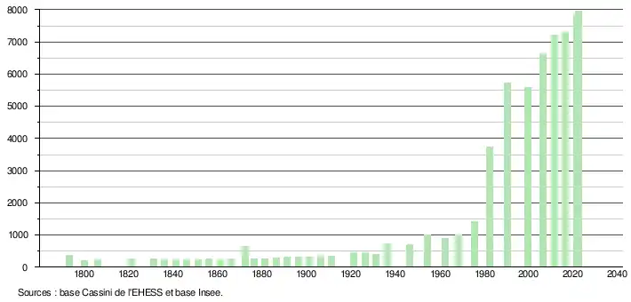 L'évolution du nombre d'habitants est connue à travers les recensements de la population effectués dans la commune depuis 1793. Pour les communes de moins de 10 000 habitants, une enquête de recensement portant sur toute la population est réalisée tous les cinq ans, les populations de référence des années intermédiaires étant quant à elles estimées par interpolation ou extrapolation[30]. Pour la commune, le premier recensement exhaustif entrant dans le cadre du nouveau dispositif a été réalisé en 2006[31].