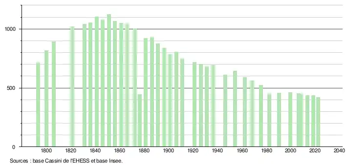 En 2022, la commune comptait 421 habitants[Note 3], en évolution de −2,32 % par rapport à 2016 (Aisne : −1,97 %, France hors Mayotte : +2,11 %).