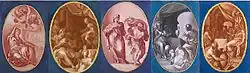 Il existe aussi un certain nombre de copies dessinées et de contre-épreuves à la sanguine des autres compositions perdues. On note ainsi une contre-épreuve de Jésus pardonne à la femme adultère (château de Fontainebleau), une contre-épreuve de La Guérison du paralytique (château de Fontainebleau), une contre-épreuve de L'Ange apparaissant en songe à Joseph (château de Fontainebleau)[52], et une copie dessinée accompagnée d'une contre-épreuve du Christ chassant les marchands du Temple (Paris, École nationale supérieure des beaux-arts)[53]. Certaines œuvres, enfin, nous sont totalement inconnues, mais sont citées par le père Dan et par l'abbé Guilbert : c'est le cas de Jésus et la Samaritaine près du puits de Jacob, de La Transfiguration sur le mont Thabor, et de Jésus ordonnant de rendre à César ce qui lui appartient. Il existe également un modello préparatoire à La Religion, dont l'œuvre finale est encore présente à l'angle de la voûte[54]. La peinture comme la grisaille se distinguent ici par un style étonnamment sage et « classique », contrastant ainsi avec les figures voisines.