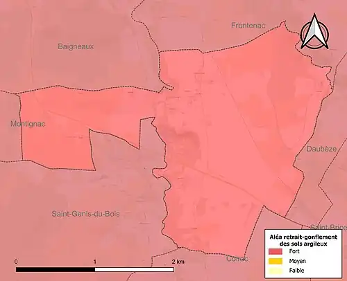 Le retrait-gonflement des sols argileux est susceptible d'engendrer des dommages importants aux bâtiments en cas d’alternance de périodes de sécheresse et de pluie. La totalité de la commune est en aléa moyen ou fort (67,4 % au niveau départemental et 48,5 % au niveau national). Sur les 60 bâtiments dénombrés sur la commune en 2019, 60 sont en aléa moyen ou fort, soit 100 %, à comparer aux 84 % au niveau départemental et 54 % au niveau national. Une cartographie de l'exposition du territoire national au retrait gonflement des sols argileux est disponible sur le site du BRGM[18],[Carte 2].