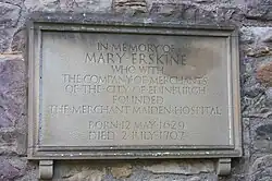 En 1694, Mary Erskine, alors connue sous le nom de Mme Hair, fait don de 10 000 merks à la Merchant Company of Edinburgh pour l'entretien des filles de bourgeois de la ville d'Édimbourg[3]. L'argent est utilisé pour établir le Merchant Maiden Hospital, une école pour filles, sur Cowgate. En 1706, Mme Hair fait un autre don pour acheter une maison et un jardin à l'extérieur des remparts de la ville à Bristo. En 1707, elle fait don de 4 000 merks supplémentaires à l'hôpital[4], conservant le droit de nommer deux membres de la famille Erskine comme gouverneurs[5]. La mémorialiste Elisabeth West est maîtresse d'école en 1708.