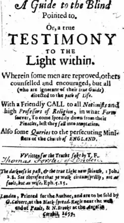 - ↑ Titre complet : A guide to the blind pointed to, or, A true testimony to the light within wherein some men are reproved, others counselled and encouraged, but all (who are ignoranr [sic] of their true guide) directed to the path of life : with a friendly call to all notionists and high professors of religion, in what form soever, to come speedily down from their pinacles, lest they fall into temptation : also some queries to the persecuting ministers of the Church of England / vvritten for the truth sake by T.F.