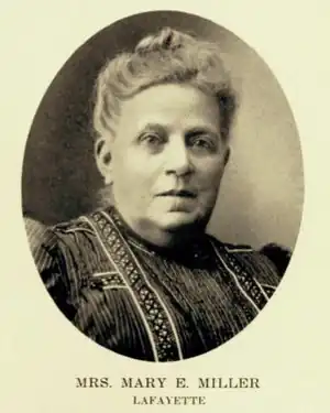 Mary E. Miller (1843-1921) s'installe dans le territoire du Colorado en 1863 avec son mari, Lafayette Miller. Après la mort de son mari, elle fonde la ville de Lafayette, Colorado, nommée en l'honneur de son mari. Miller est connue comme la « Mère de Lafayette » [1],[2]. Elle est la première femme présidente de banque aux États-Unis, philanthrope et femme d'affaires reconnue.