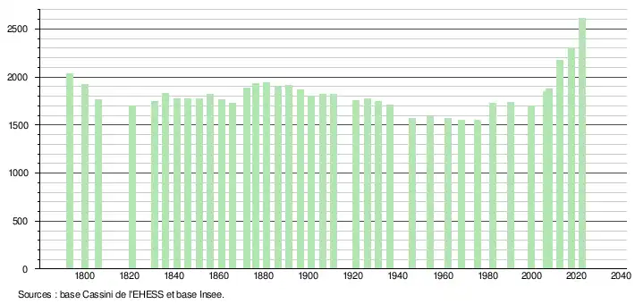 - ↑ Population municipale de référence en vigueur au 1er janvier 2025, millésimée 2022, définie dans les limites territoriales en vigueur au 1er janvier 2024, date de référence statistique : 1er janvier 2022.