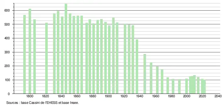L'évolution du nombre d'habitants est connue à travers les recensements de la population effectués dans la commune depuis 1793. Pour les communes de moins de 10 000 habitants, une enquête de recensement portant sur toute la population est réalisée tous les cinq ans, les populations de référence des années intermédiaires étant quant à elles estimées par interpolation ou extrapolation[34]. Pour la commune, le premier recensement exhaustif entrant dans le cadre du nouveau dispositif a été réalisé en 2004[35].