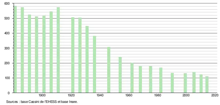 - ↑ Par convention dans Wikipédia, le principe a été retenu de n’afficher dans le tableau des recensements et le graphique, pour les populations légales postérieures à 1999, que les populations correspondant à une enquête exhaustive de recensement pour les communes de moins de 10 000 habitants, et que les populations des années 2006, 2011, 2016, etc. pour les communes de plus de 10 000 habitants, ainsi que la dernière population légale publiée par l’Insee pour l'ensemble des communes.