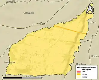Le retrait-gonflement des sols argileux est susceptible d'engendrer des dommages importants aux bâtiments en cas d’alternance de périodes de sécheresse et de pluie. La totalité de la commune est en aléa moyen ou fort (44,5 % au niveau départemental et 48,5 % au niveau national). Sur les 159 bâtiments dénombrés sur la commune en 2019, 159 sont en aléa moyen ou fort, soit 100 %, à comparer aux 75 % au niveau départemental et 54 % au niveau national. Une cartographie de l'exposition du territoire national au retrait gonflement des sols argileux est disponible sur le site du BRGM[20],[Carte 3].