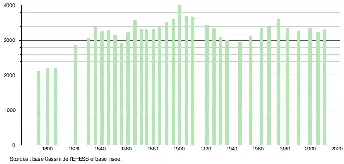 L'évolution du nombre d'habitants est connue à travers les recensements de la population effectués dans la commune depuis 1793. À partir du , les populations légales des communes sont publiées annuellement dans le cadre d'un recensement qui repose désormais sur une collecte d'information annuelle, concernant successivement tous les territoires communaux au cours d'une période de cinq ans. Pour les communes de moins de 10 000 habitants, une enquête de recensement portant sur toute la population est réalisée tous les cinq ans, les populations légales des années intermédiaires étant quant à elles estimées par interpolation ou extrapolation[14]. Pour la commune, le premier recensement exhaustif entrant dans le cadre du nouveau dispositif a été réalisé en 2005[15],[Note 1].