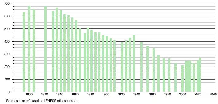 - ↑ Population municipale de référence en vigueur au 1er janvier 2025, millésimée 2022, définie dans les limites territoriales en vigueur au 1er janvier 2024, date de référence statistique : 1er janvier 2022.