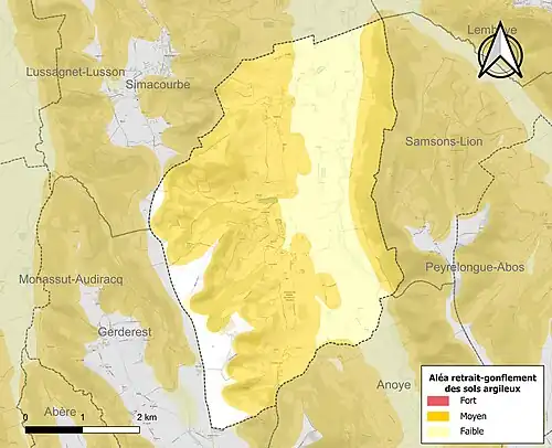 Le retrait-gonflement des sols argileux est susceptible d'engendrer des dommages importants aux bâtiments en cas d’alternance de périodes de sécheresse et de pluie[31]. 65,4 % de la superficie communale est en aléa moyen ou fort (59 % au niveau départemental et 48,5 % au niveau national)[Carte 5]. Depuis le , en application de la loi ELAN, différentes contraintes s'imposent aux vendeurs, maîtres d'ouvrages ou constructeurs de biens situés dans une zone classée en aléa moyen ou fort[Note 6],[32].