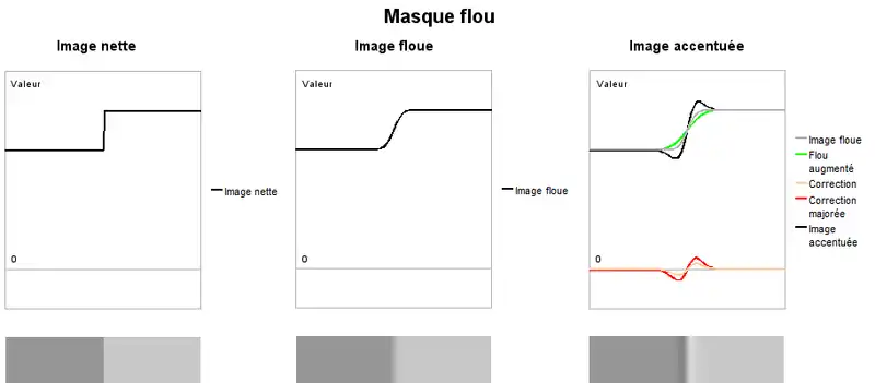 Une image dont la netteté est jugée contestable (les fins détails de plus hautes fréquences spatiales ne ressortent pas clairement) est dupliquée et la netteté du duplicata est encore réduite en lui appliquant un flou gaussien. La différence entre les valeurs de l'image originale et celles du duplicata définit le masque flou (filtre passe-haut) qui, ajouté à l'image de départ, renforcera les détails.