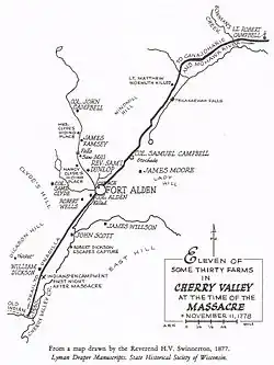Cherry Valley dispose d'un fort en palissades (construit après le raid de Brant sur Cobleskill) qui entoure la maison d'assemblée du village. Il est défendu par une garnison de 300 soldats du 7e régiment du Massachusetts (en) de l'armée continentale commandé par le colonel Ichabod Alden (en). Alden et son équipe de commandement sont alertés le par des espions Onneiouts que la force de Butler-Brant se déplace en direction de Cherry Valley. Cependant, il ne prend pas de précautions particulières et continue notamment d'occuper un quartier général à quelque 370 mètres du fort[n. 3],[19]. La force de Butler arrive près de Cherry Valley tard le et établit un camp sans feu pour éviter d'être détecté. Une reconnaissance de la ville permet à Butler d'identifier la faiblesse de la position d'Alden, et il décide d'envoyer une force contre le quartier général d'Alden et un autre contre le fort. Butler fait promettre aux Amérindiens de ne pas nuire aux non-combattants lors d'un conseil tenu cette nuit-là[2].