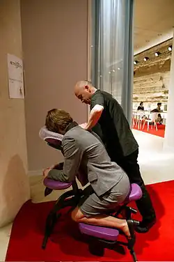 Le massage amma sur chaise, ce massage vise à amoindrir sinon faire disparaître le stress accumulé en période de travail. Le massage sur chaise fut originellement développé par David Palmer[26], un Américain qui désirait un moyen facile de masser ses clients chez Apple. Il fut le premier à concevoir en 1983 un kata (enchaînement précis et codifié de manœuvres) efficace et puissant pour détendre le dos, les épaules, les bras, les mains, la tête et la nuque en 15 minutes. Le amma assis est donné à travers des vêtements, le receveur étant assis sur une chaise ergonomique.