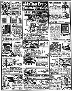 - ↑ Reproduction d'une page d'annonces publiées en 1918 dans un catalogue de Sears, Roebuck and Company. Dessin tiré de (en) Rachel P. Maines, The Technology of Orgasm : "Hysteria," the Vibrator, and Women's Sexual Satisfaction, Baltimore, The Johns Hopkins University Press, , 181 p., poche (ISBN 978-0-8018-6646-3, LCCN 98020213, lire en ligne).