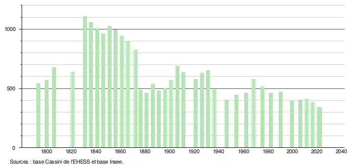 L'évolution du nombre d'habitants est connue à travers les recensements de la population effectués dans la commune depuis 1793. Pour les communes de moins de 10 000 habitants, une enquête de recensement portant sur toute la population est réalisée tous les cinq ans, les populations de référence des années intermédiaires étant quant à elles estimées par interpolation ou extrapolation[18]. Pour la commune, le premier recensement exhaustif entrant dans le cadre du nouveau dispositif a été réalisé en 2006[19].