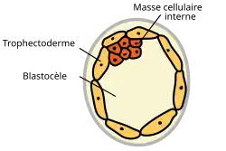 La séparation physique et fonctionnelle de la masse cellulaire interne du trophectoderme est une caractéristique particulière du développement des mammifères et constitue la première spécification de la lignée cellulaire dans ces embryons. Après la fécondation dans l'oviducte, l'embryon de mammifère subit une série relativement lente de clivages pour produire une morula à huit cellules. Chaque cellule de la morula, augmente le contact de surface avec ses voisines dans un processus appelé compactage. Il en résulte une polarisation des cellules dans la morula et un clivage supplémentaire donnant un blastocyste d'environ 32 cellules[2]. Chez la souris, environ 12 cellules internes composent la nouvelle masse cellulaire interne et 20 à 24 cellules composent le trophectoderme environnant[3],[4]. Il existe une variation entre les espèces de mammifères quant au nombre de cellules au compactage avec des embryons bovins montrant des différences liées au compactage dès 9-15 cellules et chez les lapins pas avant 32 cellules. Il existe également des variations entre embryons d'une même espèce[5].
