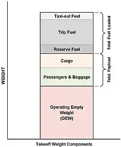 La MTOW inclut la totalité de ce qui est à bord, la masse à vide de l'appareil, les équipements et aménagements intérieurs, les consommables (dont le carburant), l'équipage, les passagers et le fret[1].