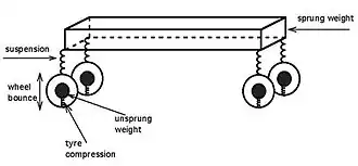 Les masses non suspendues comprennent donc la masse des composants tels que les axes de roues, roulements de roues, moyeux de roues, pneus et une partie du poids des arbres de transmission, ressorts amortisseurs et biellettes de suspension. Si les freins du véhicule sont montés à l'extérieur de la caisse, c'est-à-dire dans la roue, leur masse est également non suspendue.