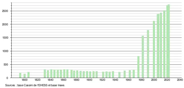 L'évolution du nombre d'habitants est connue à travers les recensements de la population effectués dans la commune depuis 1793. Pour les communes de moins de 10 000 habitants, une enquête de recensement portant sur toute la population est réalisée tous les cinq ans, les populations de référence des années intermédiaires étant quant à elles estimées par interpolation ou extrapolation[23]. Pour la commune, le premier recensement exhaustif entrant dans le cadre du nouveau dispositif a été réalisé en 2005[24].