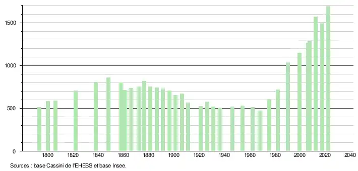 L'évolution du nombre d'habitants est connue à travers les recensements de la population effectués dans la commune depuis 1793. Pour les communes de moins de 10 000 habitants, une enquête de recensement portant sur toute la population est réalisée tous les cinq ans, les populations de référence des années intermédiaires étant quant à elles estimées par interpolation ou extrapolation[16]. Pour la commune, le premier recensement exhaustif entrant dans le cadre du nouveau dispositif a été réalisé en 2007[17].