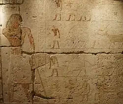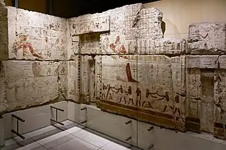 La chapelle (ou chambre des offrandes), découverte fortuitement et bien plutôt par Auguste Mariette, est fouillée par Steindorf et Wilhelm Sieglin (de)[17],[79],[80]. Le nom du propriétaire du mastaba, dont les signes hiéroglyphiques apparaissent sur les bas-reliefs de la chapelle, est identifié vers la fin du mois de [78],[81]. Après le démantèlement du mastaba, les dalles sur lesquelles la fresque murale de la chapelle est transportée jusqu'au Landesmuseum Württemberg en 1911[80],[77]. Seules les plaques formant l'assise du revêtement des murs de la chapelle, dépourvues de bas-reliefs, sont laisées sur place, dans leur état d'origine[82]. En , l'institut d'égyptologie de l'université de Tübingen rachète les vestiges du mastaba pour un montant s'élevant entre 30 000 et 40 000 Marks[82].
