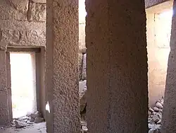 La porte donnant accès à la chambre des offrandes est nichée dans un décrochement vers l'intérieur de 3,17 m de long et 15 cm de profondeur[2]. Deux colonnes, à base carrée de 0,56 × cm de côté, viennent flanquer la porte[2]. L'agencement global présente une asymétrie : les deux piliers sont décalés vers le sud par rapport à la ligne médiane de la porte de la chapelle[2].