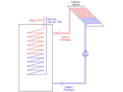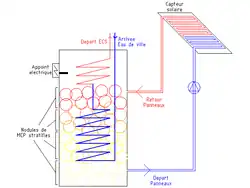 - par ailleurs, ne pouvant élever indéfiniment la température du volume de stockage (risque de vaporisation du fluide néfaste aux pompes de circulation), il est en revanche possible de stocker cette chaleur sous forme latente sans pour autant élever la température du matériau (en utilisant par exemple un MCP dont la température de fusion se situe aux environs de 60 °C ou 70 °C). Cette chaleur supplémentaire accumulée sera cédée par la suite au réseau d'eau chaude sanitaire.