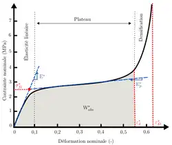 Finalement à partir d’une certaine déformation , la contrainte augmente rapidement, dans la zone de densification. Cette déformation est appelée déformation de l’initiation de la densification . Le matériau cellulaire est totalement densifié lorsqu’il atteint la déformation .