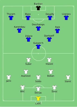 Les observations de Didier Deschamps se vérifient d'entrée. Asanovic effectue une magnifique passe pour Davor Suker qui était parti dans le dos de la défense, et qui aurait été sifflé hors-jeu si Lilian Thuram était remonté comme le reste de la défense tricolore. Le défenseur ayant remis en jeu l'avant-centre croate, celui-ci ne rate pas une telle opportunité. Il fusille un Barthez impuissant. La France se retrouve menée dès l'entame de la seconde période, à la 46e minute.