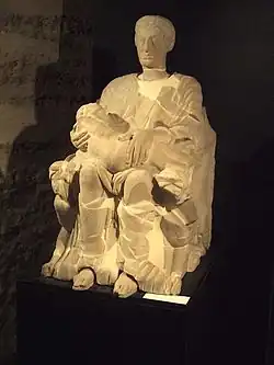Taillée dans un bloc de pietra fetida, cette figuration sculptée de Mater Matuta (déesse de l'aurore, de la venue au monde, de la maternité...) fut restaurée après sa découverte au XIXe siècle et certaines parties manquantes reconstituées.