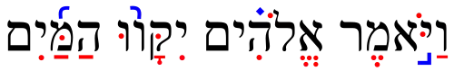 Genèse 1:9 Et Dieu dit: « Que les eaux se rassemblent (...) ». En rouge, les voyelles des Massorètes.