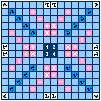 - Si une tuile est posée de telle sorte qu'elle correspond au résultat de deux opérations, son score est compté deux fois. Par exemple, une tuile "40" posée à la fois à droite de "5" et "8" et au-dessous de "64" et "24" rapporte 80 points.