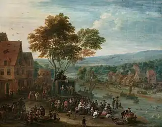 Mathys Schoevaerdts est connu pour ses paysages et ses scènes de genre. Ses paysages sont remplis d'anecdotes et de scènes délicatement peintes de paysans engagés dans une activité telle que voyager, diriger un bateau ou aller à une kermesse. Ses premières œuvres montrent l'influence des vues du marché et d'autres scènes surpeuplées de Jan Brueghel l'Ancien. Il avait la même préférence pour l’utilisation de bleus clairs et de verts délicats que Brueghel. Jan Brueghel l'Ancien a commencé la tradition des peintures de paysages avec des scènes décoratives au début du xviie siècle. Son style a fortement marqué le xviiie siècle pour les générations de peintres flamands suivants : Izaak van Oosten, Peeter Gijsels, Adriaen Frans Boudewyns, Pieter Bout, divers membres de la famille van Bredael, Balthasar Beschey, Carel Beschey (en) et Théobald Michau. Le sens bucolique du bonheur est typique de tous leurs paysages, avec leurs petites figures aux poses anecdotiques et détaillées et bâtiments agréables[5].