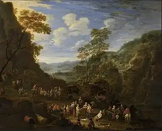- 1 2 3 Adriaen Frans Boudewyns and Mathys Schoevaerdts, A classical landscape with travelers and a shepherd crossing a river chez Galerie Jan de Maere